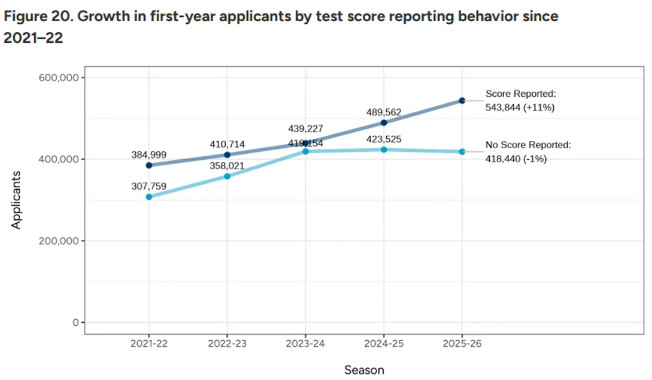 早申阶段,共有543,844名学生递交SAT或ACT成绩,较去年增加11%;而选择不提交标化成绩的学生数则减少1%,这是近五个申请季来首次出现下降。