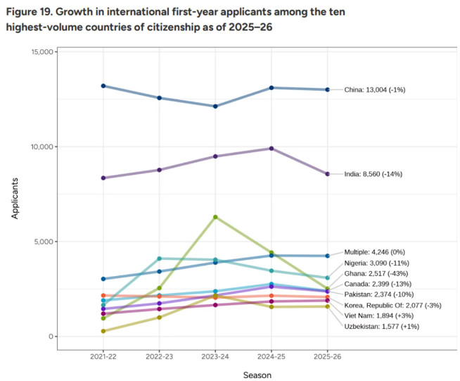 在整体申请量上涨的背景下,共有72,405名国际学生递交早申材料,较去年同期下降9%,与美国本土申请者7%的涨幅形成鲜明对比。