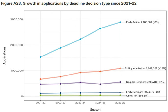 在所有申请轮次中,EA的增长突出,申请量达2,883,301份,同比增长9%,不仅参与人数多,也是增长迅速的一轮。EA的核心优势在于不绑定录取结果,申请者可提前获取录取信息,同时保留后续常规申请的选择权,加之大量Top30-50院校开放EA通道,使其成为申请者眼中的“低风险优先级”选择。